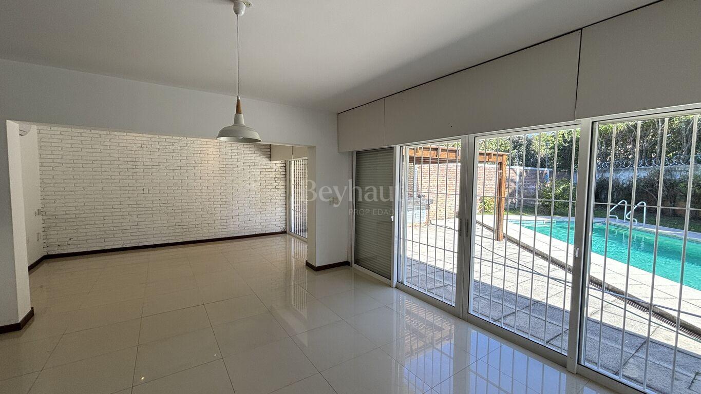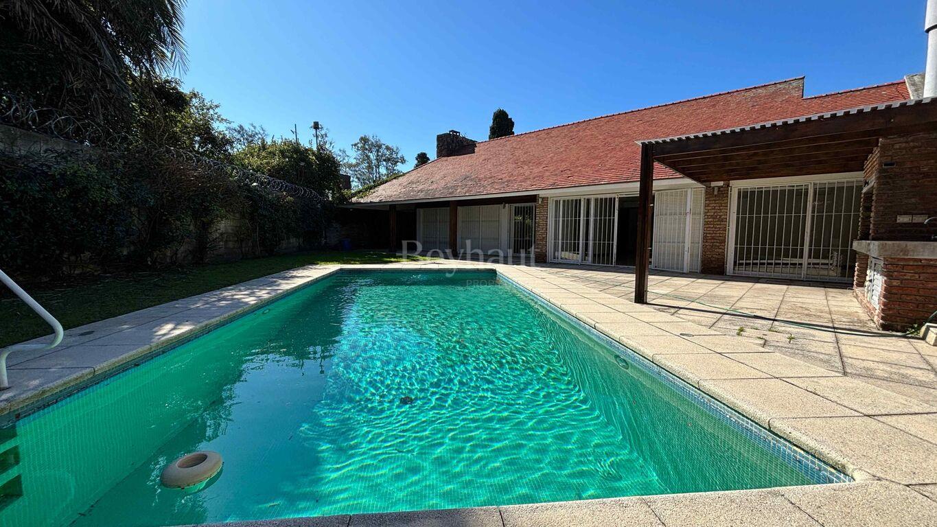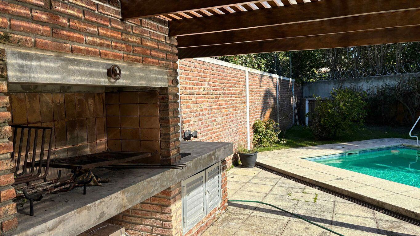 Parrillero con pérgola integrado a la casa, jardín al fondo y gran piscina.