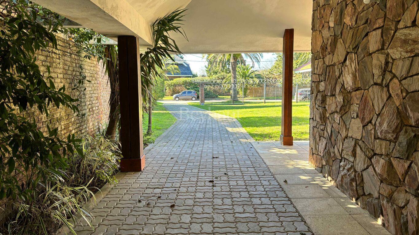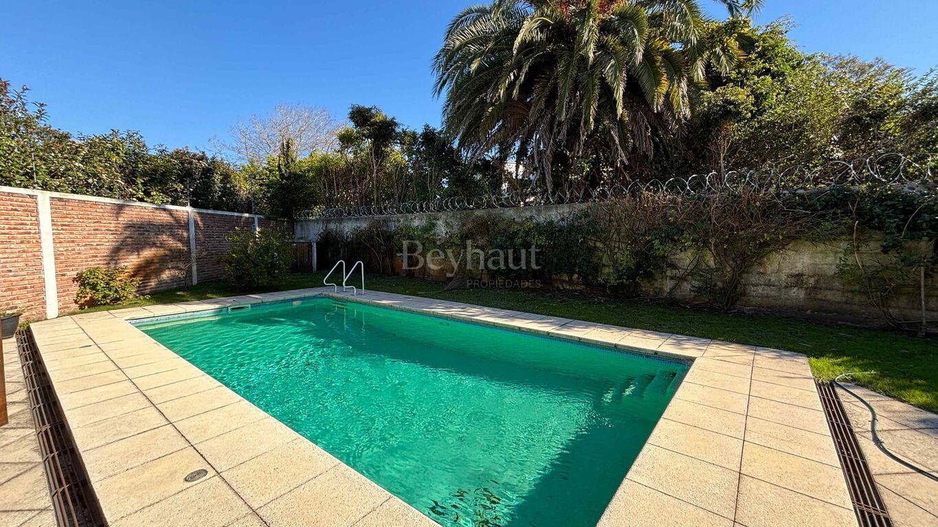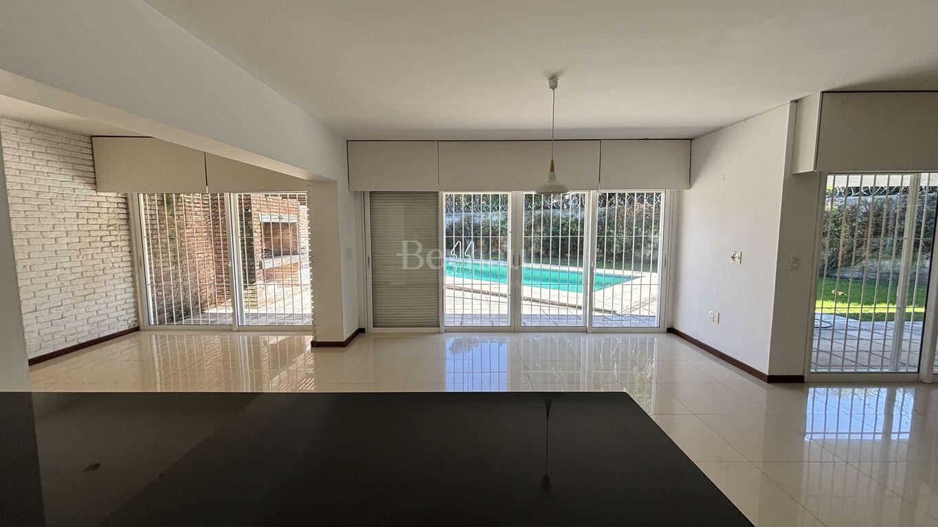 Parrillero con pérgola integrado a la casa, jardín al fondo y gran piscina.