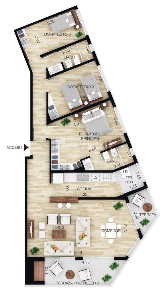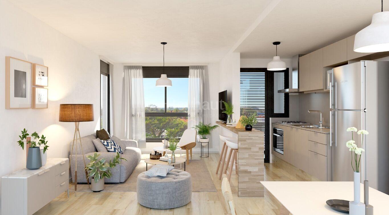 Tiene un amplio living comedor con cocina integrada y acceso a dos terrazas, una de ellas con parrillero.