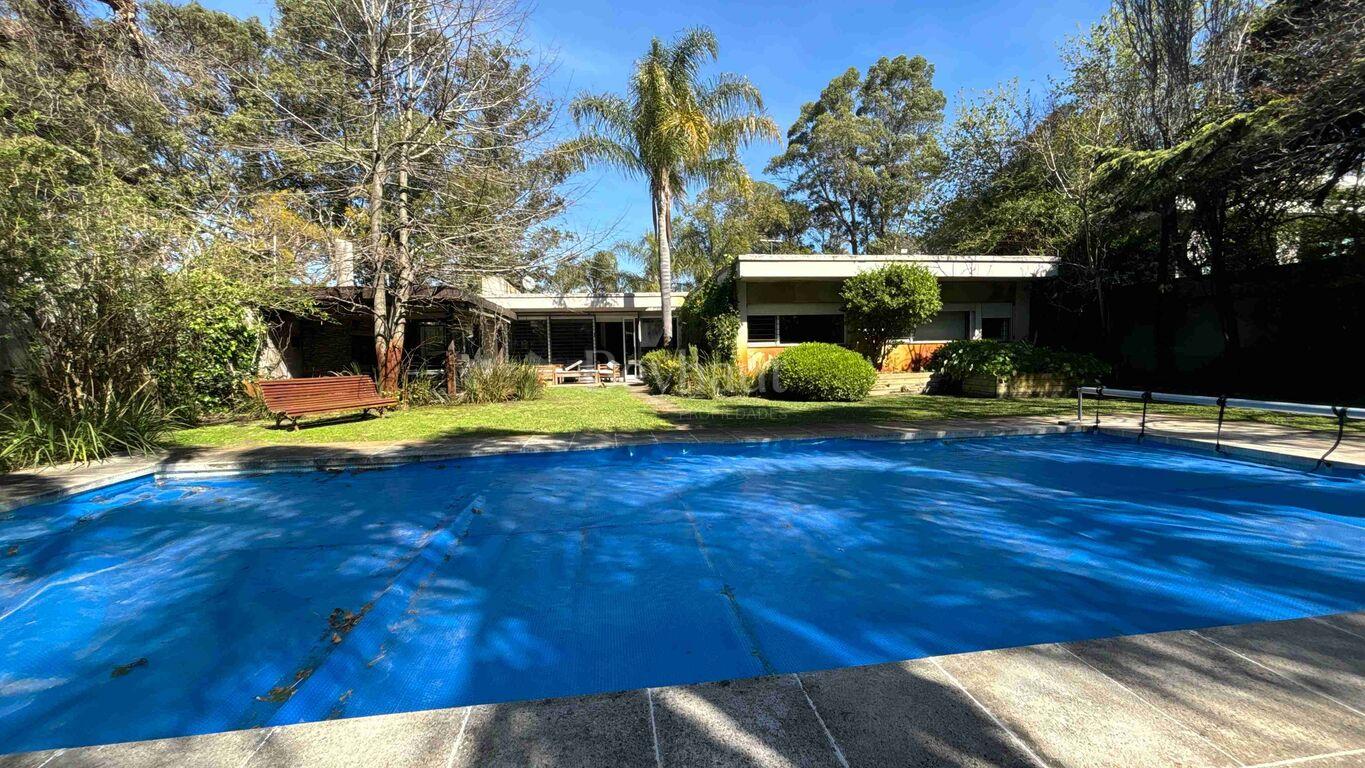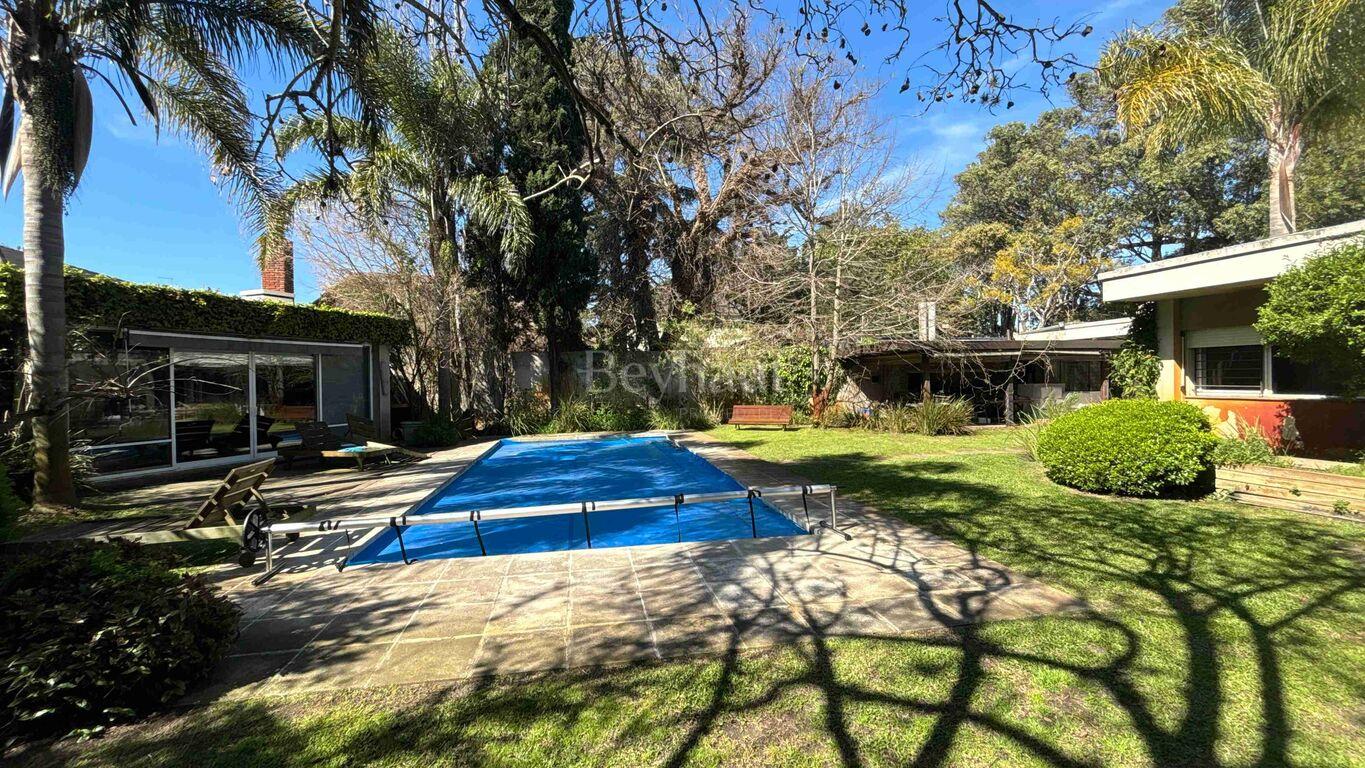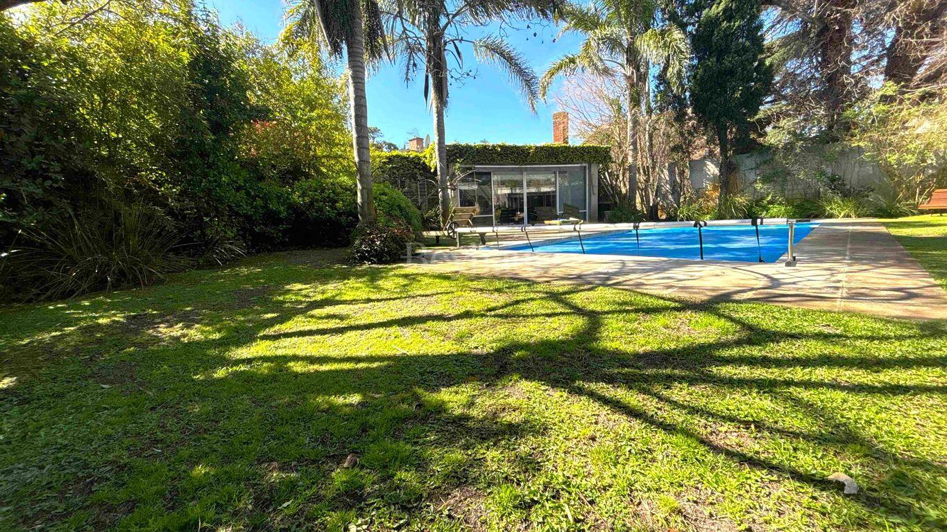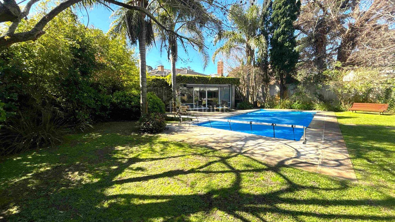 Exterior al fondo con divino jardín con muy buenos árboles. Parrillero con estructura liviana y piscina.